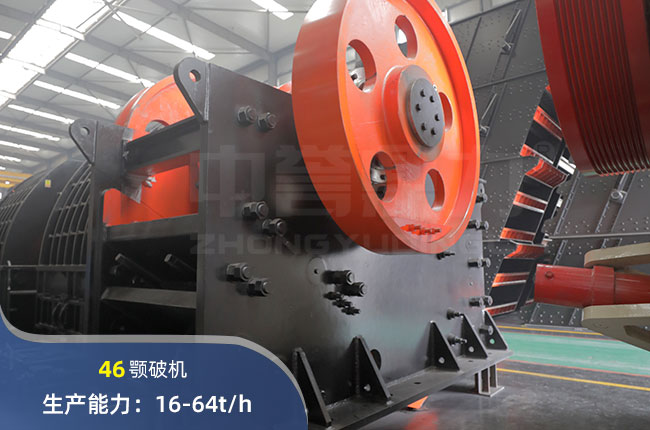 46破碎機(jī)每小時(shí)產(chǎn)量16-64噸,設(shè)備進(jìn)料尺寸為400x600mm,可破粒度小于340mm的花崗巖,石灰石,玄武巖等硬度小于320兆帕的各種巖石。