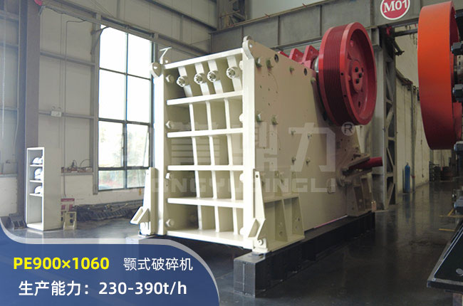 PE900×1060顎式破碎機(jī)進(jìn)料口尺寸900×1060mm,進(jìn)料粒度685mm,出料大小230-290mm,時(shí)產(chǎn)量在230-390噸,外形尺寸2870×2420×2940mm。